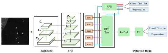 Basic pipeline of detecting SAR ship targets using Faster R-CNN. The backbone is built to capture abstract features, FPN to extract target features for different sized targets, RPN to generate candidate boxes, and heads to make final detection.
