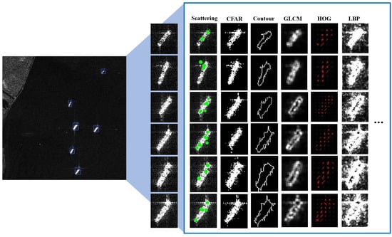 We take full account of the physical features of SAR images shown in Figure 4, especially the electromagnetic properties [49]. Of course, SAR images also contain Contour [50], HOG [51], Gray-Level Co-occurrence matrix (GLCM) [52], Canny [53], and Harris features [54], just like optical images [55,56]. Considering the specificity of electromagnetic features of SAR images, in this section we focus more on the electromagnetic scattering characteristics and three related feature-extraction algorithms are detailed here: strong scattering point extraction, peak features [57], and constant false alarm rate (CFAR) [58].