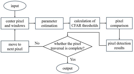 The traditional method based on specific features is to detect ships by manual features. The most commonly used method is the detection of ships based on backscattering features. Ships made of metal materials have strong backscattering properties and therefore have high gray values. The CFAR algorithm [58] is a method for adaptive threshold detection. It operates by estimating the statistical distribution around a target, based on an assumed model for the background’s probability density function, to maintain a consistent false alarm rate. The typical operation flow of the CFAR algorithm is shown in Figure 7. This approach evaluates the gray value of each pixel against a threshold that is adjusted in real time to determine if the pixel is part of the target area. To calculate this threshold, three essential components are required: a predefined false alarm rate, a statistical model for the background clutter, and a CFAR sliding window detector.
