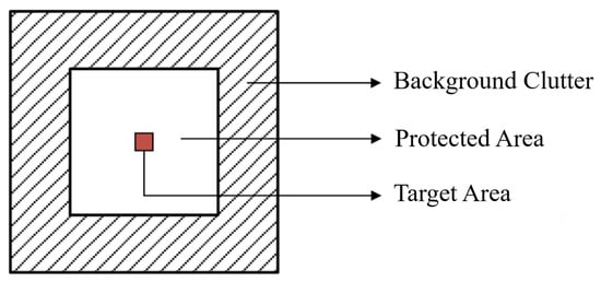 The CFAR detector scans each pixel through a sliding window to carry out target detection on a pixel-by-pixel basis. The most frequently employed sliding window for CFAR detection is the hollow window, which consists of three regions, arranged from the inside out: the target region, the protection region, and the background clutter region, as illustrated in Figure 8.