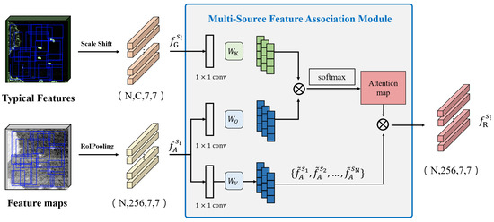 These expert features such as strong scattering points, peak features, and CFAR provide explicit, high-level information that is interpretable and robust to noise, complementing the rich, hierarchical representations learned by the CNN. This combination leverages the strengths of both approaches, ensuring that the model captures both global and local features of SAR ships, thus promising to improve overall detection performance. Specifically, as illustrated in Figure 10, the network abstract feature vector and the SAR ship expert feature vector are associated, where is extracted from the corresponding coordinate positions on the depth feature maps, and the feature vector of (256, 7, 7) is obtained by ROI-Pooling. The specific operation is to map the candidate regions to the corresponding positions of feature maps, divide the mapped area into cells of the same size, and afterwards perform the maximum pooling operation for each cell; in this way, the corresponding feature vectors of fixed size can be obtained from the candidate regions of different sizes. ROI-Pooling significantly enhances processing efficiency. Since each detection map corresponds to a specific set of expert feature maps for SAR ships, a scaling operation is applied to transform the feature maps of varying sizes into a consistent shape of (C, 7, 7), where C denotes channel number. The multi-source features association module captures the relationships between these vectors. We adopt the scaled dot product attention to associate the two extracted features, which can be formulated as: