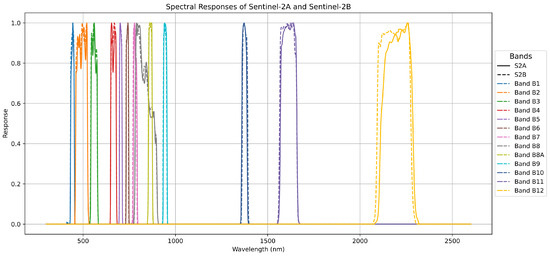 Spectral response functions of the MSI instrument onboard Sentinels 2A and 2B [45].