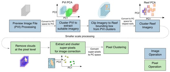 After this initial image selection, a second filtering step is applied to the selected scenes. Individual reefs are cropped using the UNEP World Conservation Monitoring Centre global distribution of coral reefs dataset [66], which consists of separate polygons containing the geographic extent of each reef. This ensures that only the subsets of reef areas is retained, and not vast areas of open sea (step 3 in Figure 2). This step is crucial as it reduces the computational load and allows for local-scale colour corrections, since entire scene colour transformations would result in suboptimal correction. By applying PCA once again to these cropped images, we can further filter the data for optimum visualisation and observe the variation colour and amount of clouds present (step 4 in Figure 2). This additional step ensures that the final dataset is of the highest quality, with minimal atmospheric and illumination artefacts, facilitating more accurate and reliable remote sensing analysis. The cropped images can also be clustered for optimal image selection.