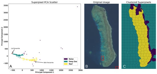 (A) The results of applying PCA to the superpixels extracted using SLIC [79]. The sea segments tend to follow a cubic relationship, whilst the relevant reef areas are linear. It can also be seen that the PCs are negative due to the inverse correlation between input variables in (B) the original image and (C) the unsupervised classification result on the PCs of the superpixels. Red bounding boxes highlight points at the 1st percentile and 80th percentile of each cluster (B), respectively, with points shown in scatter plot (A). Additional examples are provided in the Appendix Figure A5.