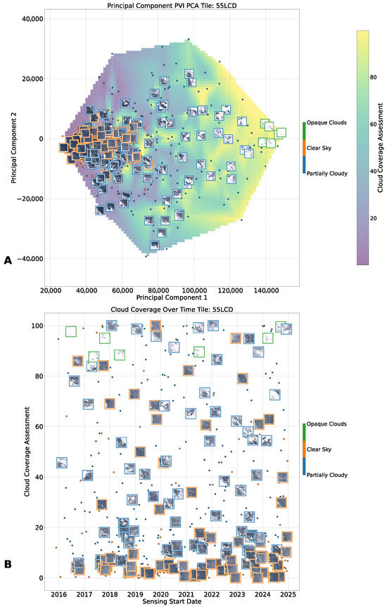 (A) PCA applied and plotted with the first 2 components to PVIs of tile 55LCD comparing the ESA cloud coverage assessment with the imagery itself (a total of 554 tiles are used). As PC1 increases, so do the amount of clouds; similarly with PC2 it increases or decreases as the orientation of the clouds shifts, whilst the images of good quality tend to plot close to each other. Similar trends are observed in (B) time-series analysis vs. ESA cloud coverage.