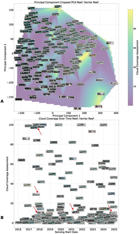 (A) PCA applied to the screened PVIs, with the ESA automated cloud coverage assessment values as a background image, showing that well-balanced images are closer together, whilst glinty and cloudy images also group together separately. (B) PCA cluster analysis of the same reef, showing that automated cloud coverage assessments do not reliably indicate the usability of an image. Even points at 100% cloud coverage may contain usable data, and conversely at 0% (red arrows show examples) the imagery may not be usable; additional examples included in the Appendix Figure A4.