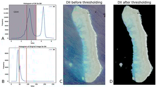 (A) Image histogram of B4 after extracting the DII, OTSU thresholds shown in red, with the first two thresholds showing the sea and glint components of the imagery. (B) Original image histogram of B4 scaled to 255, the histogram is improperly stretched showing OTSU automatic thresholds picking out only the brightest pixels. (C) Results of the DII before clipping the sea and (D) after clipping the sea using the automatic thresholding, eliminating the first two population thresholds leaving the true signal of the reef.