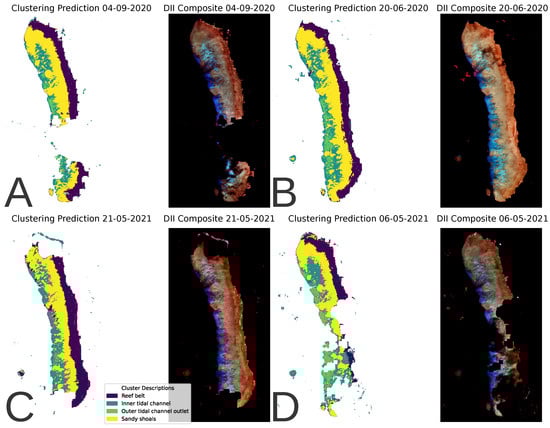 Qualitative results show that meaningful clusters can be found even under relatively complex imaging conditions, i.e., lots of thin cirrus clouds (Figure 8D). The spectral signature of the reef belt, shoals, and inner and outer tidal channels remain relatively consistent despite the different imaging conditions across time.