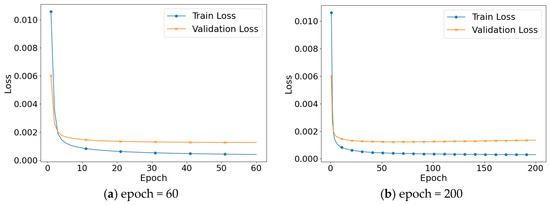 Figure 5 shows the loss change process in training and validation across epochs. In Figure 5a, both the training loss and validation loss decrease steadily as the model undergoes training, eventually leveling off after 60 epochs with reduced fluctuations. This suggests that the model is progressing along the correct optimization path. However, as shown in Figure 5b, the validation loss begins to increase when the number of epochs exceeds 60, indicating the onset of overfitting. At this stage, the model shows strong performance on the training data but its performance on unseen data starts to deteriorate. Based on the above analysis, was selected as the best number of training rounds.