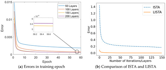 Figure 6 illustrates the relationship between the number of network layers and the error. As the number of layers increases, the loss initially decreases. However, when the number of layers reaches 200, the error begins to rise, indicating overfitting. Based on the results shown in Figure 6a, a network with 150 layers is selected as the optimal configuration, striking a balance between model complexity and generalization ability. Figure 6b illustrates the correlation between the error and the number of iterations/layers. The figure demonstrates that the error associated with the trained LISTA algorithm is considerably lower than that of the ISTA algorithm. Compared with the ISTA algorithm, the LISTA algorithm is able to adjust the network parameters more efficiently through the introduction of a learning mechanism, thus achieving a lower error level within a smaller number of iterations, which further highlights its advantages in algorithm optimization and performance enhancement.