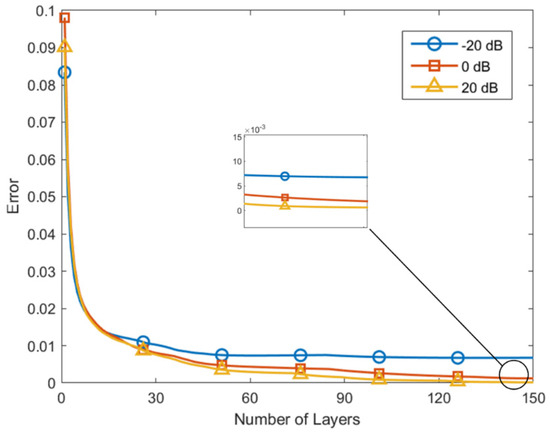 Figure 7 displays the relationship between the network layer numbers and the error for different SNRs. The effectiveness of the training process is strongly indicated by the observed decrease in loss with an increasing number of layers. Additionally, the error progressively reduces with an increase in SNR, which aligns with theoretical expectations.