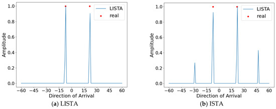 Based on the optimal parameters obtained above, the performance comparison of the LISTA and ISTA algorithms for the DOA estimation is displayed in Figure 9. The angles are set at 45° and 11°. By utilizing a well-trained LISTA network for estimation, we are able to accurately determine the azimuth of the received signal. Compared to the ISTA algorithm, which exhibits pseudo-peaks, the corresponding angles of the spectral peaks of the spatial spectrum output by the LISTA algorithm enable the accurate estimation of DOA.