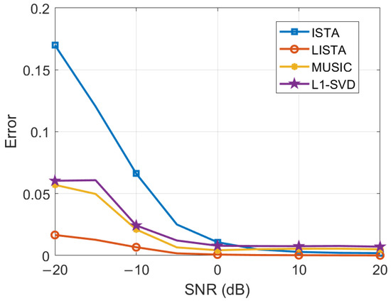 As shown in Figure 13, the LISTA algorithm consistently outperforms the other algorithms under the given SNR conditions. In particular, the LISTA algorithm exhibits significantly lower error at lower SNRs compared to the other algorithms, demonstrating its superior reliability in challenging low-SNR environments. This highlights the robustness of the LISTA algorithm, which can maintain high accuracy even when the quality of the signal is degraded by noise.