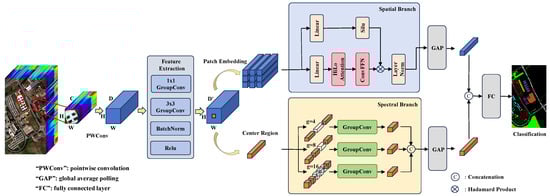 Initially, the HSI patches, derived from the neighboring region of the target pixel to be classified, are used as input. A pointwise convolution (PWConv) is applied for dimensional mapping, unifying the dimensions of the input HSI block to D, facilitating subsequent processing. The mapped HSI patches are then passed through a sequence of operations, including 1 × 1 and 3 × 3 group convolution layers, batch normalization, and a ReLU activation function. These operations extract preliminary features, yielding an initial HSI feature map. Notably, feature extraction is performed only once, without employing multiple stacked layers.