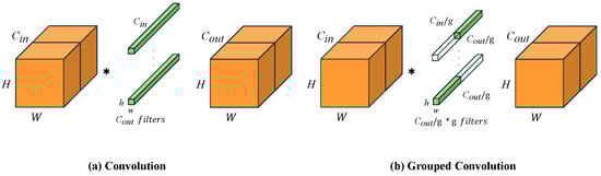 where g represents the number of groups, and each group has the shape , denotes the concatenation operation along the channel dimension. After grouping, each group of feature maps is assigned convolutional kernels with shapes matching their channel counts, specifically . Each group is allocated an equal number of convolutional kernels, totaling per group. Upon applying standard convolution operations to each group of feature maps, the resulting feature maps are concatenated to form the final feature map after group convolution: