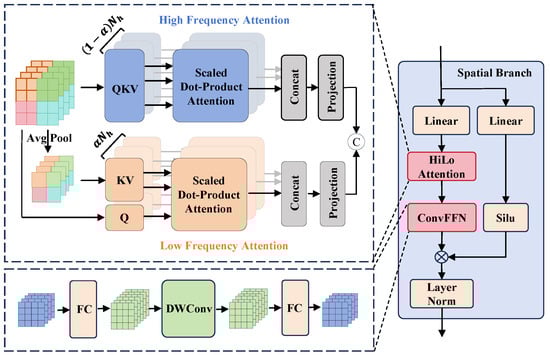 To effectively extract global features while mitigating the impact of intra-class variability in an HSI patch, we improved the ViT-based spatial branch by incorporating the HiLo attention mechanism [50], as illustrated in Figure 3. In HSIC, intra-class variability—arising from factors such as varying environmental conditions, lighting, or material properties—poses a significant challenge. The integration of HiLo attention enables the spatial branch to robustly capture both local details and global contextual information, thereby improving classification performance.