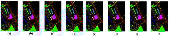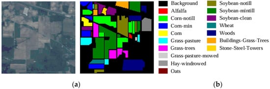 The Indian Pines dataset was collected by an Airborne Visible/Infrared Imaging Spectrometer (AVIRIS) in June 1992, focusing on agricultural regions in Northwestern Indiana, USA. It contains 145 × 145 pixels with a spatial resolution of 20 × 20 m and 220 spectral bands spanning from 400 to 2500 nm. In order to maintain the integrity of the data, 20 spectral bands were excluded, resulting in a final dataset containing 200 bands for further analysis. The dataset is renowned for its diverse vegetation types and varying soil conditions, making it a commonly used benchmark for hyperspectral image classification. Figure 4 presents the false color and ground-truth maps, and Table 1 provides the allocation of training and testing samples across the different classes.