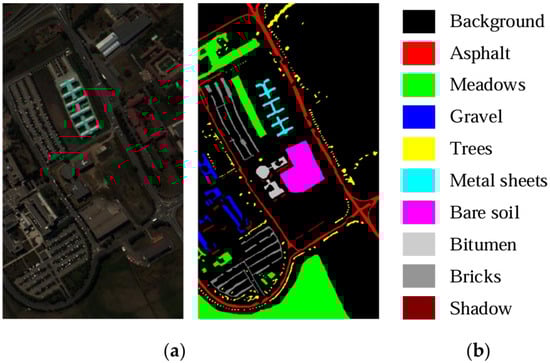 The Pavia University dataset was acquired by the Reflective Optics System Imaging Spectrometer (ROSIS) sensor over the University of Pavia, Italy. This dataset comprises 610 × 340 pixels with a high spatial resolution of 1.3 × 1.3 m and includes 103 spectral bands ranging from 430 to 860 nm. The dataset features nine land cover classes, such as buildings, trees, roads, bare soil, and water, representing a variety of urban materials and structures. This diversity facilitates the evaluation of hyperspectral classifiers in distinguishing between different urban land cover types based on their spectral characteristics. Figure 5 presents the false color and ground-truth maps, whereas Table 2 outlines the allocation of training and testing samples across each class.