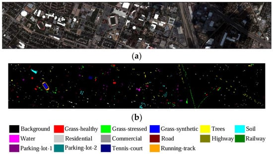 Houston 2013 dataset: (a) true color map; (b) ground truth.