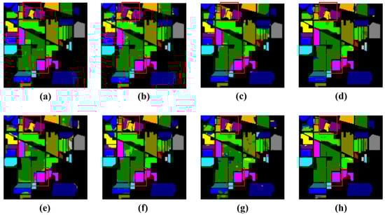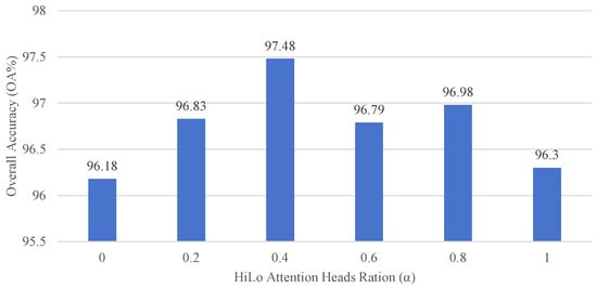 To investigate the key parameters of the proposed algorithm, experiments were conducted on the Pavia University dataset. Figure 10 presents the experimental results for different allocation ratios of high and low-frequency attention heads in HiLo attention, which is varied from 0 to 1 with a step size of 0.2. It is important to note that the classification performance is suboptimal when is set to extreme values (0 or 1). This can be attributed to the fixed local window size, which does not guarantee that all pixels within the window belong to the same category. Consequently, placing excessive emphasis on low-frequency attention can lead to the extraction of non-representative features. Conversely, focusing too much on high-frequency attention is akin to merely windowing the original ViT, which constrains its ability to capture global features. Therefore, a moderate value of yields superior performance by effectively leveraging both high and low-frequency information.