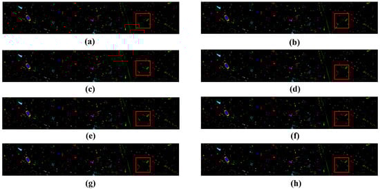 Classification maps using different methods on the Houston 2013 University dataset. (a) Ground truth, (b) SS-Mamba, (c) CT-Mixer, (d) DBDA, (e) LSFAT, (f) SSFTT, (g) SSRN, (h) Ours.
