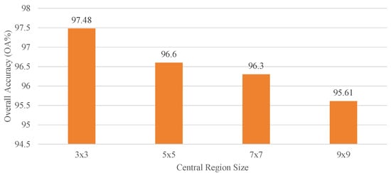 Another key parameter in the proposed method is the size of the central spectral branch. To analyze its impact on classification performance, experiments were conducted with the central region size ranging from 3 × 3 to 9 × 9, with a step size of 2. Figure 11 shows the experimental results for different sizes of the central spectral branch. A clear trend can be observed: as the size of the central region increases, the classification accuracy exhibits a corresponding decrease. This phenomenon can be explained by the fact that larger central regions are more prone to interference from neighboring pixels, which can negatively impact the critical central pixel features essential for accurate classification. Consequently, employing a smaller central pixel region proves to be more effective in achieving optimal classification performance, as it minimizes the influence of potentially irrelevant or misleading information from the surrounding context.