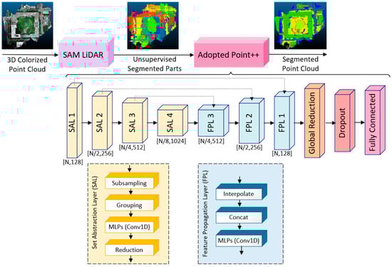 One key modification in the adopted model is its focused feature extraction approach. Unlike the original PointNet++, which processes entire point clouds at both local and global levels, the adopted model searches for and extracts features solely within the segmented parts generated by the SAM LiDAR. This adjustment eliminates the need to process the entire point cloud, allowing the model to efficiently concentrate on relevant local and global structures within each segment. As a result, it enables precise segmentation of urban features while minimizing unnecessary computations and processing time. Additionally, we introduce a new Feature Propagation layer with an extended feature space (1536 to 512 channels), which enhances the model’s ability to transfer high-dimensional learned features to lower-resolution representations. This modification helps in refining segmentation boundaries and improving per-point classification accuracy. Finally, we modify the feature extraction pipeline by introducing a Global Reduction layer to aggregate learned representations into a fixed-size descriptor. This is followed by a Dropout layer to prevent overfitting and enhance generalization, particularly for complex urban datasets, before the final classification step.