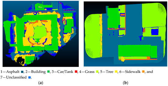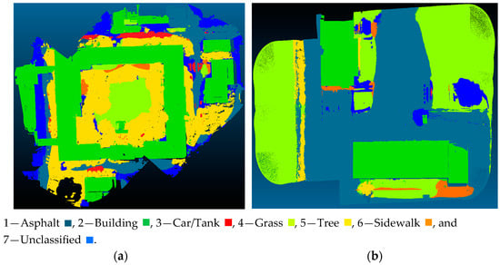 The 3D point cloud datasets are meticulously annotated using CloudCompare software [43], as illustrated in Figure 7. This process enables precise categorization of each point into predefined classes for each dataset. In the first dataset, points are labeled into six categories: 1-Asphalt, 2-Building, 3-Car, 4-Grass, 5-Tree, and 6-Sidewalk. Similarly, in the second dataset, the classes are largely the same, except that the ‘Car’ segment is replaced by ‘Tank’, which represents ‘Gas Tank’. During the annotation process, points that do not fit any of these specified classes are assigned to a separate category labeled as ‘Unclassified’. This ensures that every point in the dataset is accounted for, even if it does not correspond to the primary classes.
