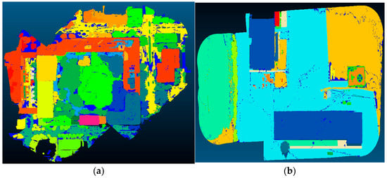 Segmented point clouds with SAM LiDAR: (a) First dataset; (b) Second dataset. Each color corresponds to a distinct segmented region within the area.