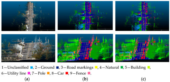 Evaluation of SAMNet++ on Toronto-3D dataset: (a) Colorized point cloud; (b) Ground truth; (c) Output of SAMNet++.