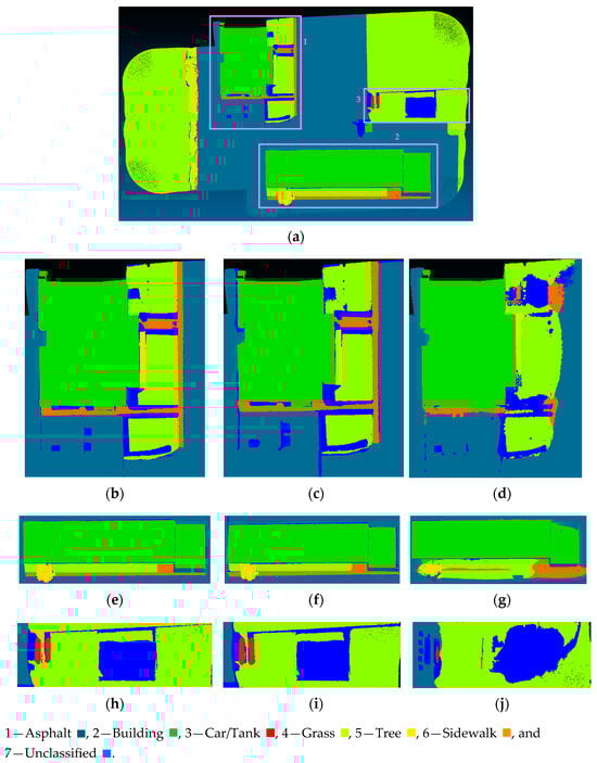 Comparison of ground truth and segmentation results from PointNet++ and SAMNet++ on selected regions of dataset 2: (a) Selected regions highlighted on the ground truth; (b,e,h) Ground truth; (c,f,i) Segmentation results from SAMNet++; (d,g,j) Segmentation results from PointNet++.