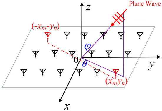 As shown in Figure 1, the antennas are uniformly arranged on the z = 0 plane for a two-dimensional planar Van Atta array. Two symmetrical antenna elements are connected by transmission lines of equal electrical length. Any antenna element located at the position (xn, yn) is connected to the antenna element located at (−xn, −yn) through the transmission line of equal electrical length. For incoming waves at any azimuth angles θ and elevation angles φ in space, the phases of the electromagnetic waves received by the two connected antenna units are and , respectively, which can be expressed as