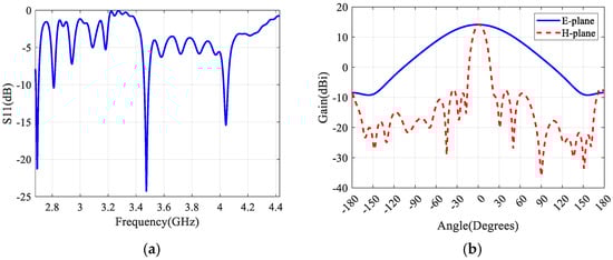 The series-fed array antenna performance. (a) Antenna S11 coefficient; (b) Antenna E-plane and H-plane directional patterns.