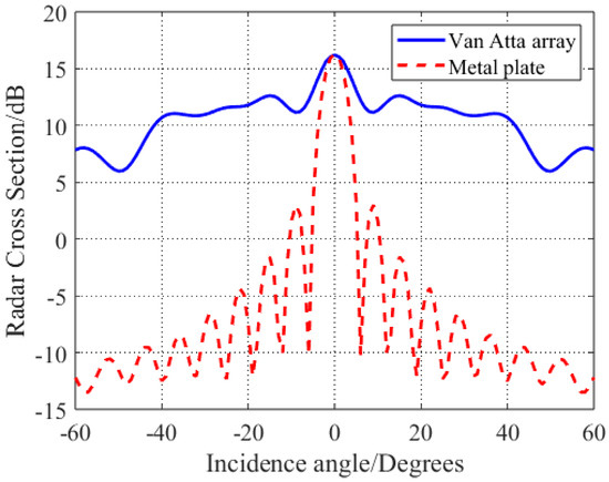 By controlling the rotating table in the range of −60° to 60°, the monostatic RCS of the designed Van Atta array at different incidence angles are tested and compared with the flat metal plate of the same size, the RCS characteristics are obtained as shown in Figure 6.