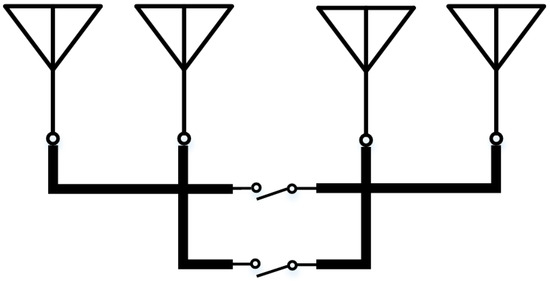 Based on the phase conjugation principle, the antenna array forms a Van Atta array and can achieve the direction of incoming waves. When not connected, since the mutually symmetrical antenna units cannot form a path, the phase conjugation principle cannot be satisfied, and a Van Atta array cannot be formed to realize the backscattering of the signal. As shown in Figure 7, the on–off control of the Van Atta array is realized by adding electronically controlled microwave switching elements to the transmission line of equal electrical length connecting two symmetrical antenna elements in the array. The design and analysis of the electronically controlled microwave switching elements are as follows.