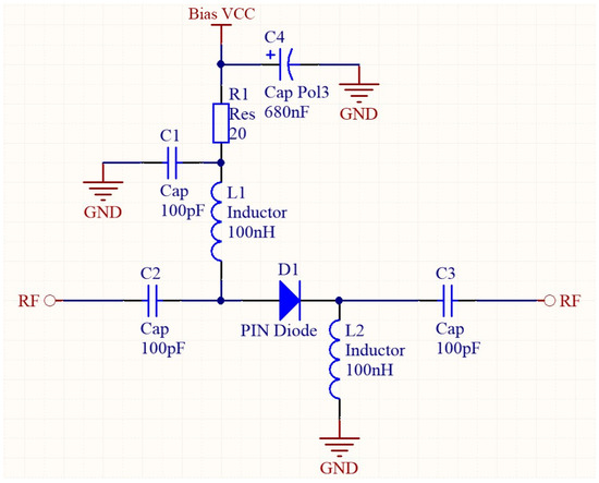 The design of the series SPST switch is shown in Figure 10. The PIN diode D1 is connected in series on the microwave path through the DC blocking capacitors C2 and C3. The cathode of the PIN diode is connected to the ground through the isolation inductor, and the anode is connected to the bias voltage through the LC isolator. A current limiting resistor R1 is connected in series with the bias voltage terminal to protect the PIN diode. In this way, the on–off of the PIN diode can be realized by controlling the bias terminal voltage. To reduce the influence of parasitic parameters, the required capacitance and inductance are all packaged with 0402 SMD. Isolation inductors use high-Q wire-wound inductors.