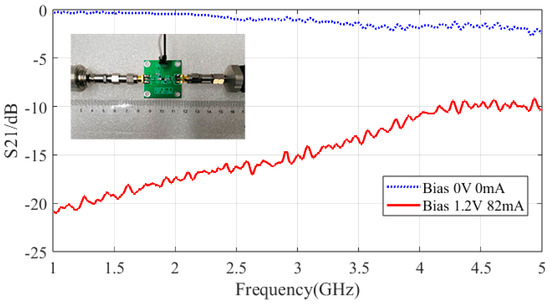 The insertion loss of the designed SPST switch under different bias voltages and currents tested by a vector network analyzer is shown in Figure 11. The resistance of the PIN diode decreases with the increase in the bias voltage, and its insertion loss decreases accordingly. When the bias voltage is 1.2 V, the bias current is 82 mA, and the resistance value of the PIN diode is 1.3 Ω, the insertion loss is −1.5 dB, which is close to the on state. When the bias voltage is 0 V, the resistance of the PIN diode is about 400 Ω, and the insertion loss is −14 dB, which is close to the cut-off state. In the working frequency band of 3.45–3.55 GHz designed in this article, the SPST switch ratio can reach 10 dB, which can meet the time-modulation requirements of the Van Atta array.