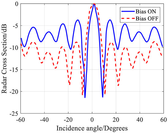 The test results, as shown in Figure 13, show that within the range of ±10 °, the RCS of the on–off state of the Van Atta array is similar. However, when the incident angle is greater than 10 °, the RCS of the on state of the Van Atta array increases by about 5 dB compared to the off state due to its directional backtracking characteristic. This means that in the case of oblique incidence, the Van Atta array has the potential for amplitude modulation and can support time modulation.