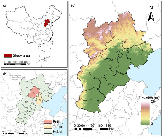 Study area. Note: (a) indicates that the BTH area is located in the north of China, (b) shows the 13 cities included in the study area, and (c) shows the elevation maps of the study area.