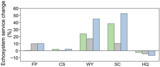 Overall, all four ESs increased from 2000 to 2020 (Figure 4), except for HQ, which decreased. The mean values of WY and SC increased by 23.93% and 38.32%, respectively, from 2000 to 2010, and by 16.99% and 10.30%, respectively, from 2010 to 2020. No significant changes were found for the mean value of FP between 2000 and 2010. However, a notable increase in the growth rate occurred during the subsequent period from 2010 to 2020, reaching 10.18%. Similarly, the mean value of CS remained relatively constant throughout the entire observation period. In contrast, the mean value of HQ continued to decrease from 2000 to 2020, exhibiting a progressively accelerating decline.