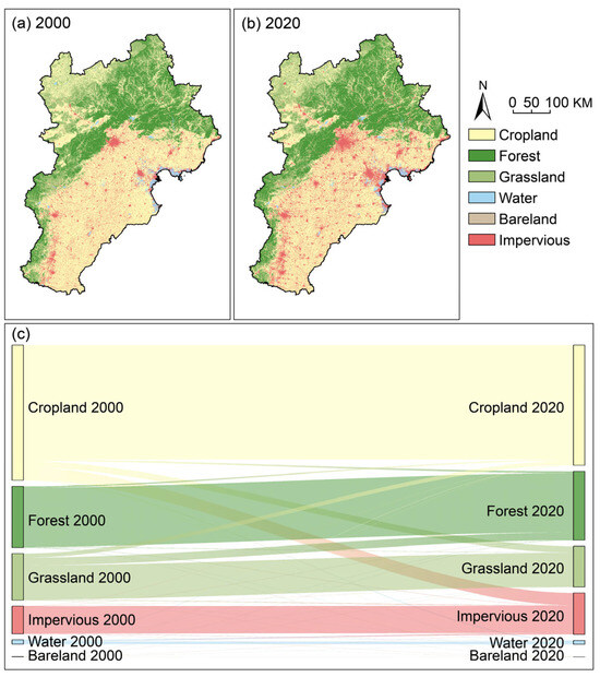 (a,b) Land use in 2000 and 2020; (c) land use conversion from 2000 to 2020.