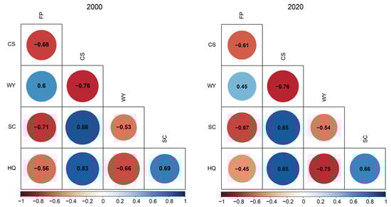 There were 10 significant correlations found among the five ESs, with all correlations showing statistical significance (p < 0.05). Among these, six pairs had negative correlations and four pairs had positive correlations. The correlations observed between ES pairs were similar across the two years (Figure 6). Between 2000 and 2020, the level of synergy among the majority of ESs grew, whereas the extent of trade-offs diminished.