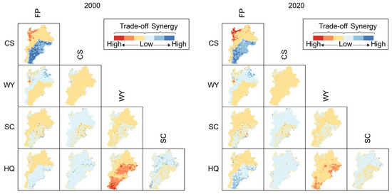 On the other hand, the ES pairs of FP-CS, WY-SC, FP-SC, CS-WY, FP-HQ, and WY-HQ were primarily characterized by trade-offs rather than synergies; in particular, the WY-HQ trade-off was notably pronounced. In 2000, significant spatial trade-offs for WY-HQ were distributed over the entire study area. By 2020, the extent of high trade-offs in the WY-HQ region had decreased, with the remaining areas being more sporadically distributed in the eastern and southern areas.