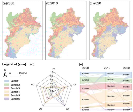 (a–c) Spatial patterns of ecosystem service bundles in 2000, 2010, and 2020. (d) The normalized values for each ecosystem service within the bundles. (e) Changes in the quantity of ecosystem service bundles from 2000 to 2010 and from 2010 to 2020.