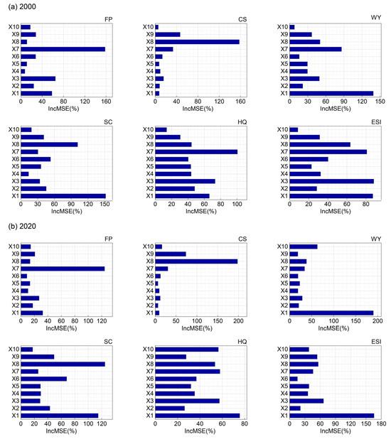 (a,b) Feature importance of drivers’ impacts on ESs in 2000 and 2020. Note: X1 indicates precipitation; X2 indicates temperature; X3 indicates FVC; X4 indicates nightlight; X5 indicates population density; X6 indicates GDP; X7 indicates cropland area ratio; X8 indicates forest area ratio; X9 indicates grassland area ratio; X10 indicates impervious area ratio.