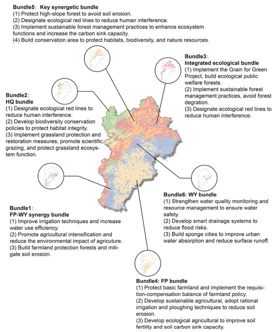 Notably, Bundle 1 exhibited a synergistic relationship for WY-FP, but the spatial–temporal analysis reflected a declining trend in their relationship (Figure 6 and Figure 7). As a result, we recommend targeted actions within this bundle to improve soil and water conservation capabilities, highlighting the importance of incorporating spatial–temporal analyses of ES interactions into urban spatial planning [25]. However, Bundle 2 showed the lowest ES supply, and regarding its spatial distribution of land use, we found that Bundle 2 was primarily distributed in grassland. Therefore, we propose the implementation of protection and restoration policies to strengthen the function of grassland ecosystems. Bundles 3 and 5 are highly synergistic, and effective management of individual or multiple ecosystem service functions can significantly enhance the performance of other services [42]. Bundle 3 exhibited CS-SC-HQ synergies, and it is primarily distributed in the transition zone from high-altitude forests to other land types, especially cropland; consequently, we propose the implementation of policies to restore farmland to forests and designate ecological red lines to ensure the ecosystem stability of the area with a high ES supply. Bundle 5 exhibited the highest ES supply capacity, which was primarily characterized by the synergies among CS, SC, and HQ. The proportion of Bundle 5 increased significantly between 2000 and 2010, remaining relatively stable from 2010 to 2020. Therefore, ES management should focus on preserving the stability of Bundle 5. Bundle 3 gradually transitioned to Bundle 5 over the study period, reflecting the positive outcomes of ecological protection initiatives, such as the Three-North Shelterbelt Program and Grain for Green Project, in mountainous areas.