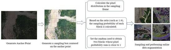 To understand the sampling technique proposed in this paper, the core steps are outlined as follows: First, we mark the corresponding anchor points on the image according to the preset step size. Next, we build a sampling frame (512 × 512 pixels) around each anchor point. Subsequently, the proportion of specific pixels in each sampling frame is calculated. On this basis, the tiles with similar proportions are selected through the overall pixel ratio. In the end, we have a well-balanced dataset and perform online enhancement processing on it to further improve the diversity and usefulness of the data. The specific steps are shown in Figure 2.