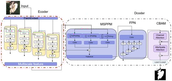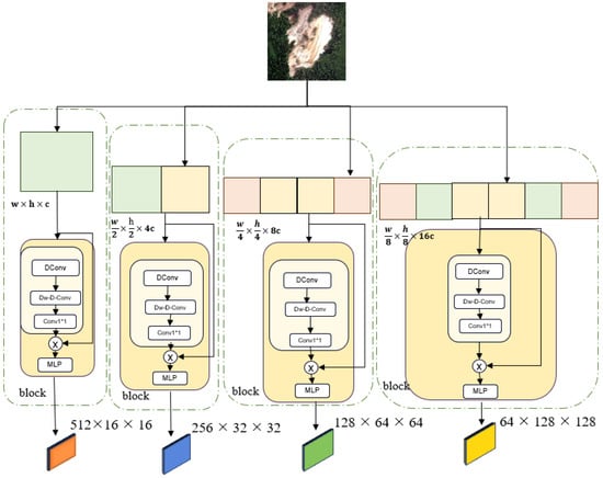 In this network structure, the PatchEmbed module uses convolution to process the input data and map it to the representation of the corresponding dimension. Subsequently, these feature representations are passed to the block module for further processing. The block module combines the large kernel attention mechanism (LKA) and the multi-layer perceptron (MLP), which can effectively capture feature information at different scales, giving full play to the advantages of the large kernel attention mechanism in long-distance dependency modeling, and combining the efficiency of MLP in local feature extraction. The output features, which are the 512-, 256-, 128-, and 64-dimensional features, represent the feature information under different fields of view, respectively. This multi-scale feature extraction method provides the model with more comprehensive contextual information, which not only enhances the generalization ability of the model and enables it to adapt to a variety of downstream tasks, but also improves the flexibility and superiority of the model when dealing with complex scenes. Its specific network structure is shown in Figure 5.