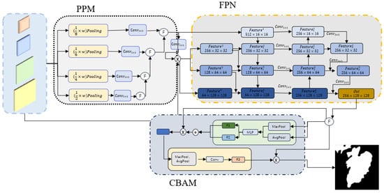 In the decoder, the encoder extracts features of different field sizes, and to fuse these features more effectively, we use the pyramid pooling module (PPM) to perform pooling, upsampling, and convolution operations on the largest size features and fuse them with deeper level features. Subsequently, the feature pyramid network (FPN) is used to further integrate the feature maps of different scales to achieve the synergy of multi-scale information. To more effectively underscore the core characteristics, we introduce a CBAM module into the fused features, which is able to adaptively highlight important feature information. Finally, the prediction result with a size of 2 × 128 × 128 is generated by the convolution operation. The specific network structure is shown in Figure 6.