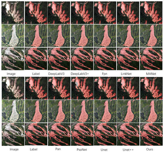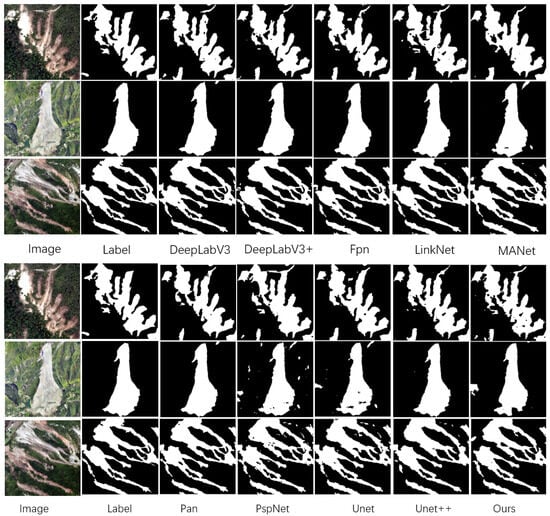 In contrast, the model proposed in this paper performs well among all the comparison models. The main reason for this is that the large kernel attention mechanism is introduced into the model. This mechanism significantly enhances the model’s ability to perceive local features of the image, improves its ability to model long-distance dependence, and optimizes spatial adaptability and channel adaptability. Through this mechanism, the model can more accurately identify the subtle features of the landslide area and effectively suppress the interference of background noise, to achieve a more accurate segmentation effect in complex scenes.
